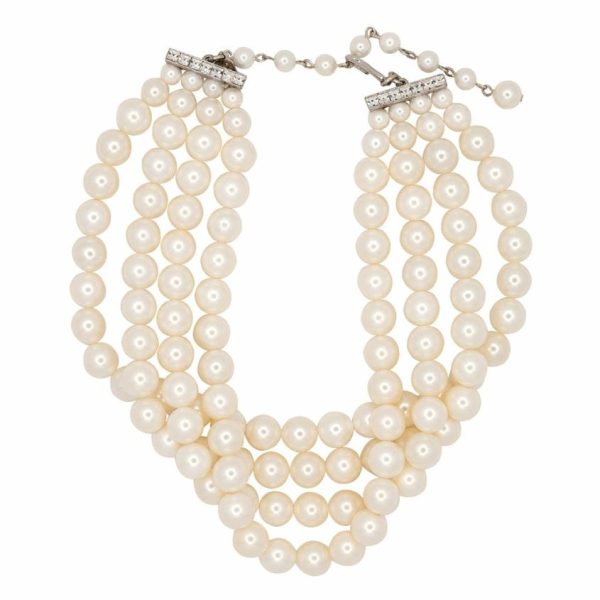Product Descriptions: Pearls are a woman’s best friend. Check out our 4 rows of white shell pearls. This stunning chocker neckline has silver and crystal bar ends with an adjustable extender. As seen in Love Magazine/Spring-Summer 2017