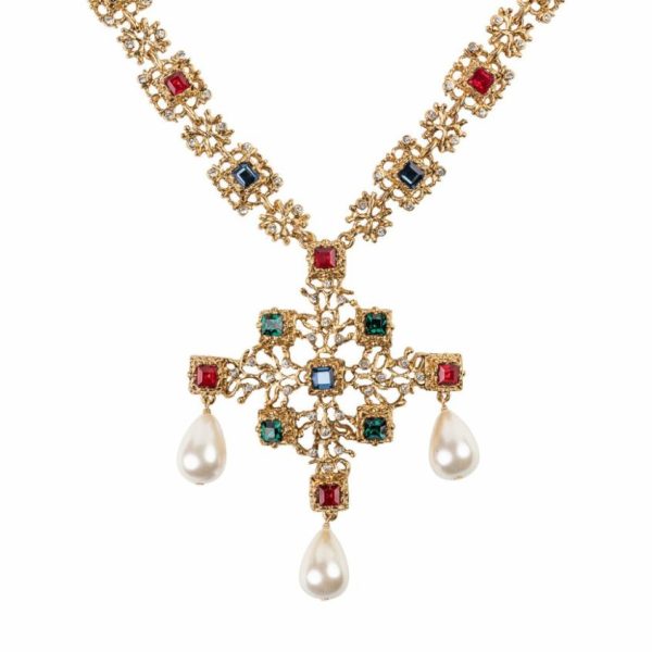 Product Description: Steal the spotlight with this stunning, specially designed antique gold and multicolor drop pendant necklace.