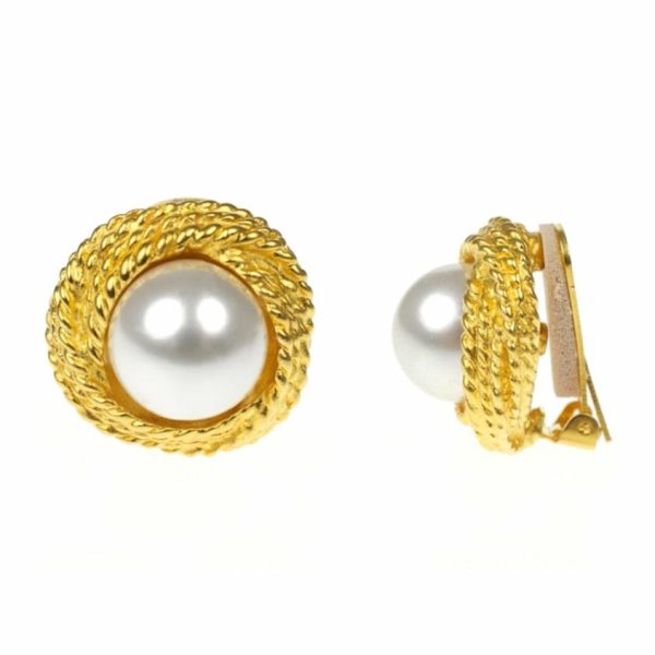 Product Description: One of the many styles that belong to Kenneth Lane’s beloved Barbara Bush Collection, these lovely, USA-made, gold-plated clip-on earrings add a sweet touch with a faux pearl center and “rope” texture.