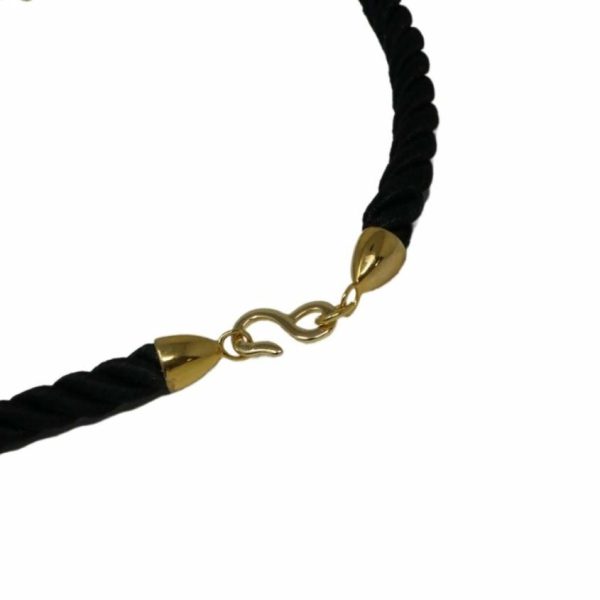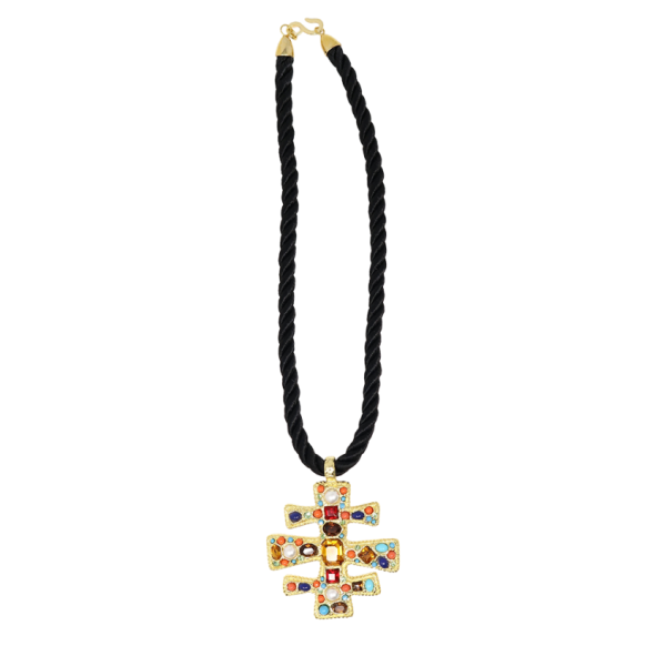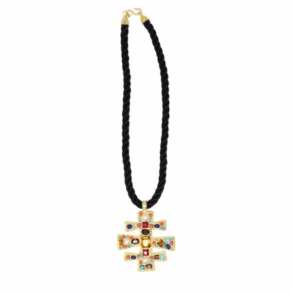 Product Description: A modern update on the Maltese cross flower. Satin gold cross with multi color stones dangling from a black cord makes this jewel adorned pendant stand out on its own. Finished with a “S” hook closure.