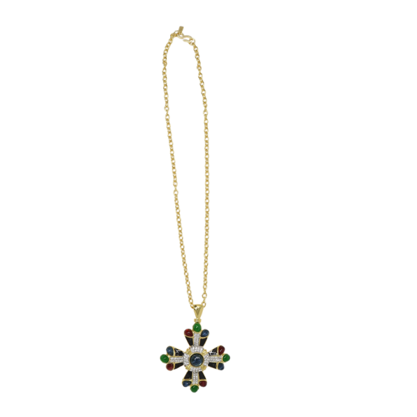 Product Description: Elevate your style with this captivating gold chain multi cabs necklace. A sophisticated black enamel sapphire center cross pendant delivers rich color depth and distinctive elegance to this exceptional piece.