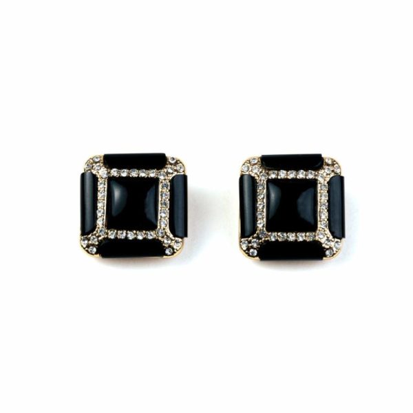 Product Description: Make a statement with these stunning gold and rhinestone black square earrings. Expertly crafted with a classic square design, these elegant earrings are adorned with luxe rhinestones, a touch of gold and a secure clip backing.