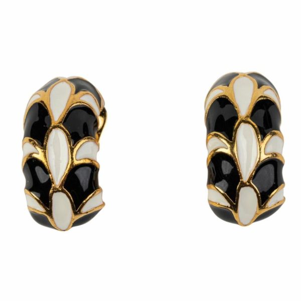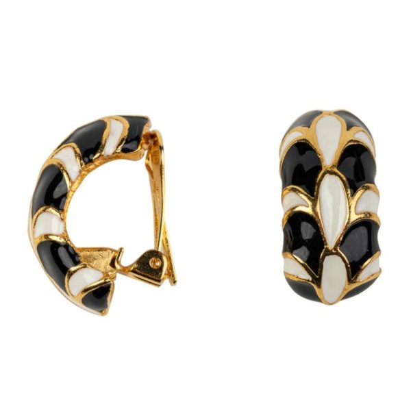Product Description: These sophisticated small gold hoop clip earrings showcase striking black and white enamel accents that instantly elevate your everyday style.