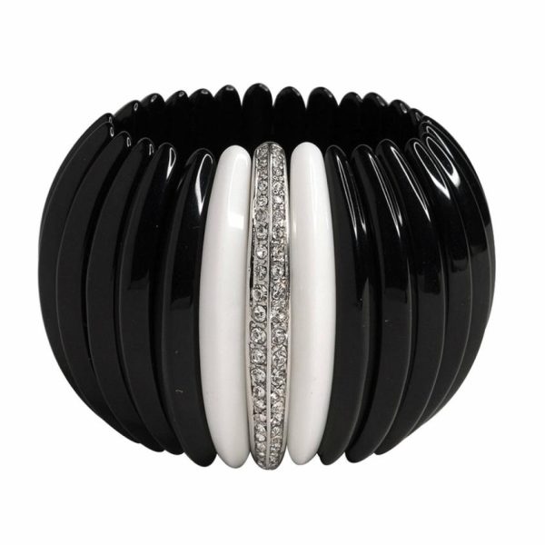 Product Description: Our black and white resin stretch bracelet glistens with a single row of glass rhinestone crystals.