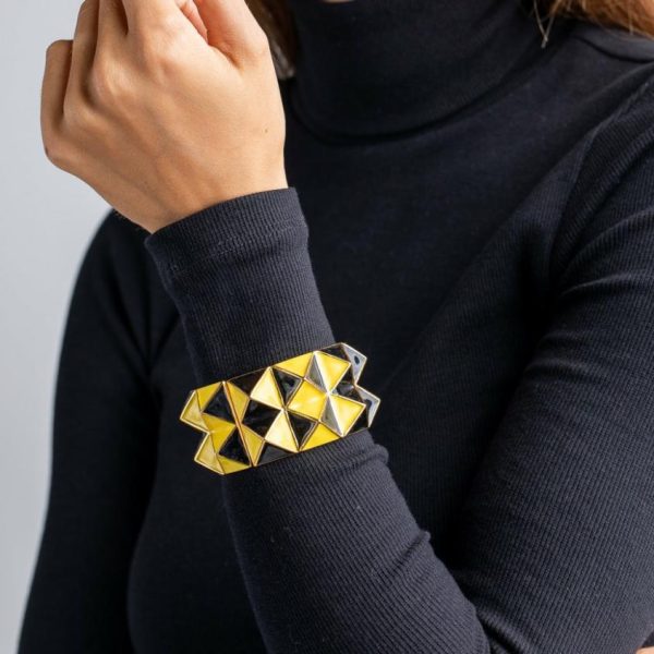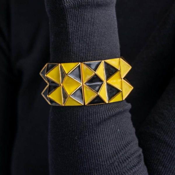 Product Description: Make a bold geometric statement with this sophisticated black and yellow enamel pyramid bangle featuring elegant gold-tone accents. This eye-catching piece adds modern edge to any outfit while maintaining timeless appeal.