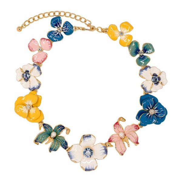 Product Description: This elegant gold-tone necklace features vibrant enamel floral accents that create a stunning focal point for any outfit. The beautifully crafted floral design adds a touch of sophisticated charm, perfect for elevating your everyday style or special occasions. Closed with an adjustable fish hook closure for customizable comfort and fit.