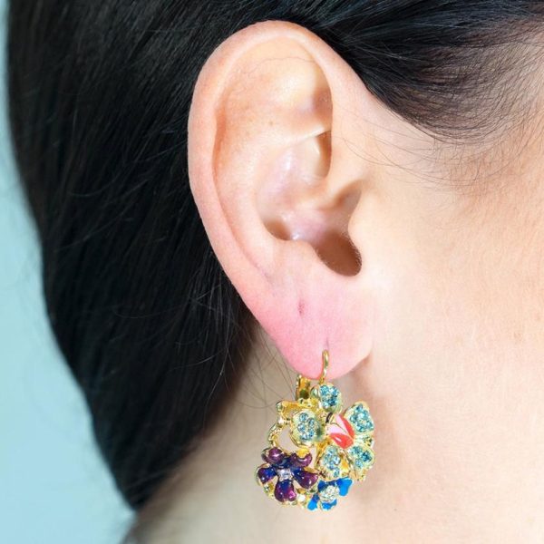 Product Description: Carry a bouquet on your ears when you wear these gold plated multi pastel and colored enamel flower drop pierced earrings.