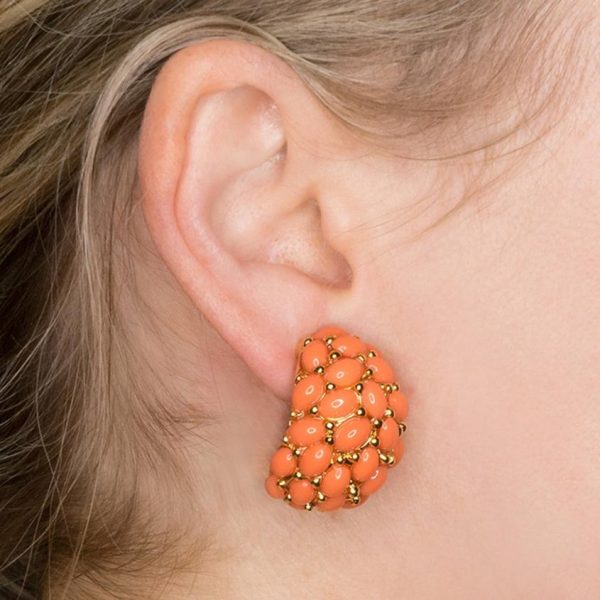 Product Description: Brighten up any outfit with these vibrant gold and light coral cabochons domed hoop earrings.
