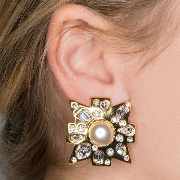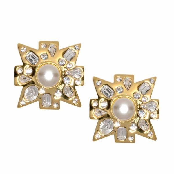 Product Description: Gold-plated, glass crystal encrusted clip-on earrings with a polished Maltese cross and a faux glass pearl center will add immediate elevation to your outfit.