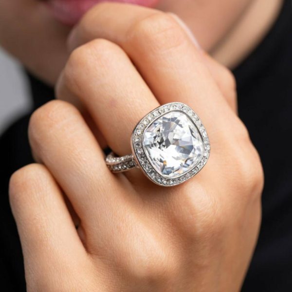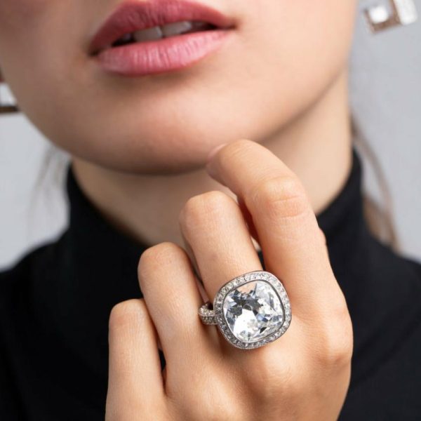 Product Description: Brilliant facets maximize the dazzling sparkle of this exquisite solitaire cocktail ring, elegantly framed by a shimmering pave halo that catches the light from every angle.