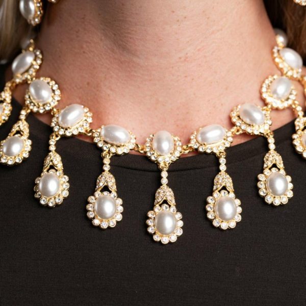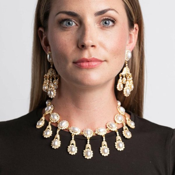 Product Description: Crystal accents in gold surrounding white Cultura pearls dangle brightly on a collar necklace that brings a mix of play and drama to any outfit at any occasion.