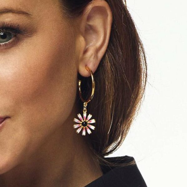 Product Description: These dainty white and pink enamel starring a black cabachon center daisy hoop earrings add subtle color to any look.