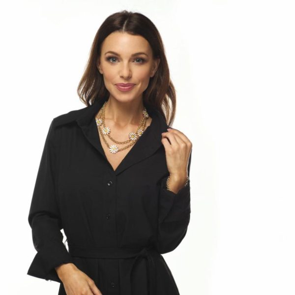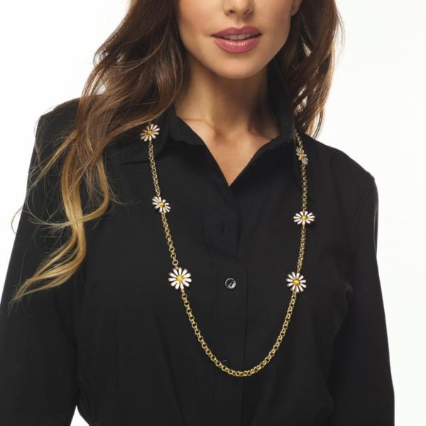 Product Description: Brighten your day with this simple, yet statement gold and white enamel hook necklace detailed with yellow cabochon center daisies.