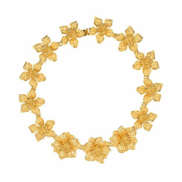 Product Description: Adorn your neckline with a strand of mesmerizing satin gold dogwood flowers. Closed with a push and lock clasp.