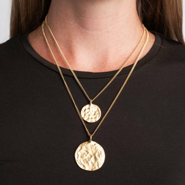 A double layer of delicate gold chains with hanging coin pendants add shine to any neckline.