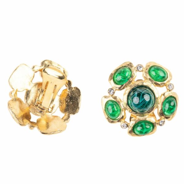 Product Description: Catch their eye with these darling satin gold and crystal clip-on earrings embellished with emerald cabochons.