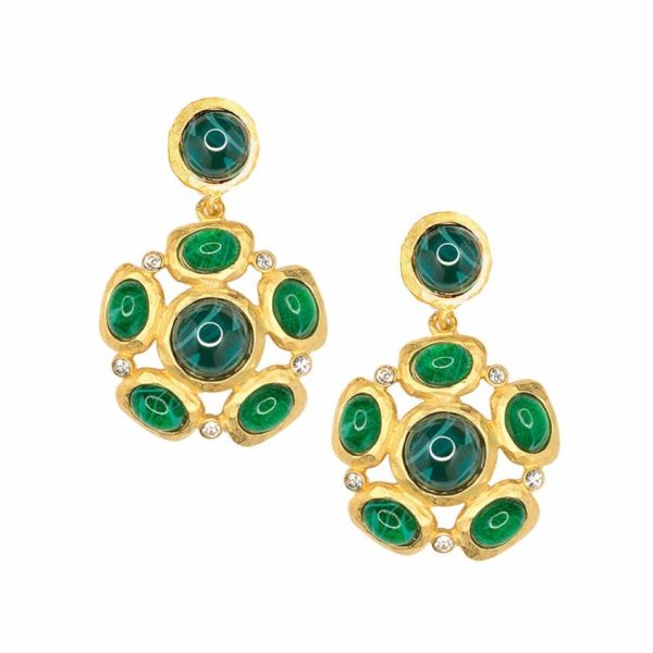 Product Description: These stunning hammered satin gold earrings feature exquisite emerald cabochon clusters complemented by sparkling clear crystal accents, creating an elegant statement piece perfect for special occasions and evening events.