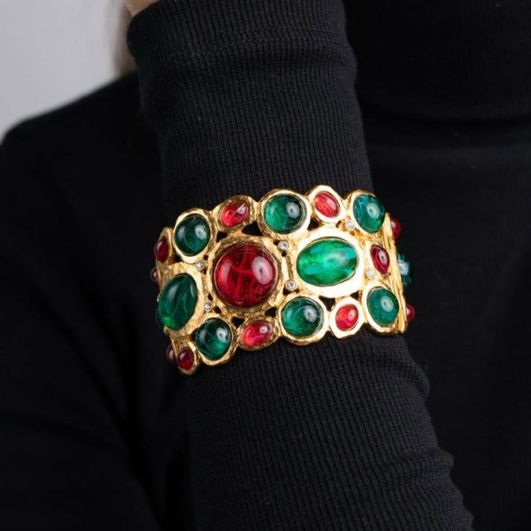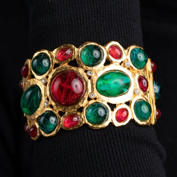 Product Description: Rich ruby and emerald cabochons set in gleaming satin gold finish create a stunning vintage-inspired statement piece that adds timeless elegance to any outfit.