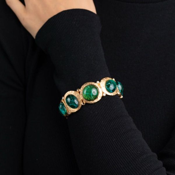 Product Description: Add a little sparkle and shine to your wrist with this ornate emerald cabochon bangle featuring crystal accents to dress up any outfit. Pair with our Flawed Emerald Cabochon Drop Clip Earrings.