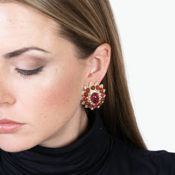 Product Description: Set in two tone gold, these dramatic ruby center stone earrings are surrounded by rhinestones and a halo of faux rubies.