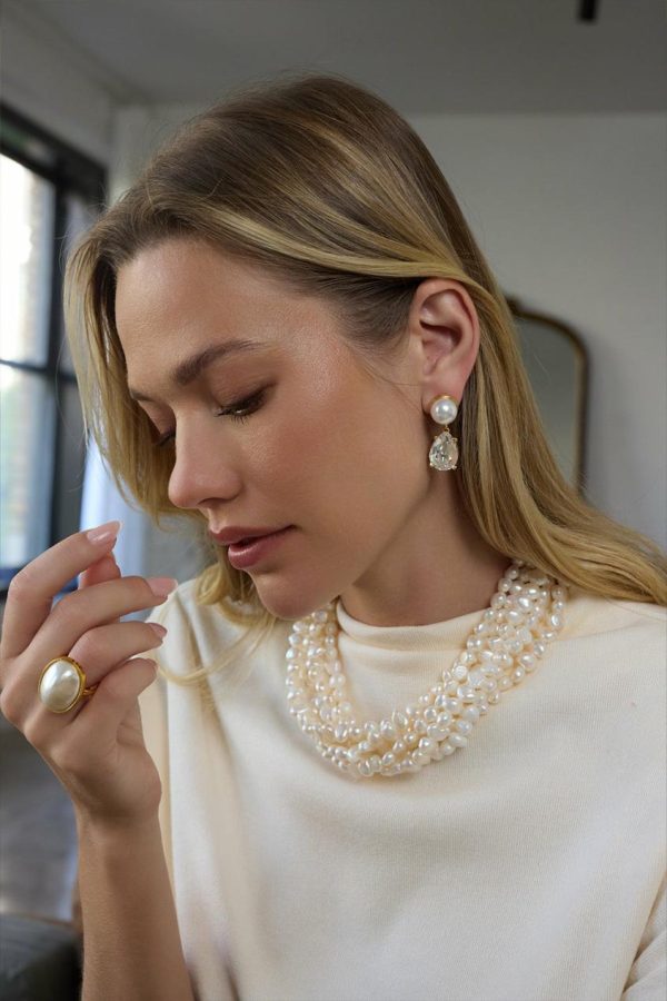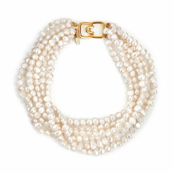 Product Description: Dress up any outfit with this 6-row freshwater pearl necklace. The polished gold hook clasp adds a touch of elegance to this luxurious statement piece. Perfect for those who want to make a refined fashion statement.