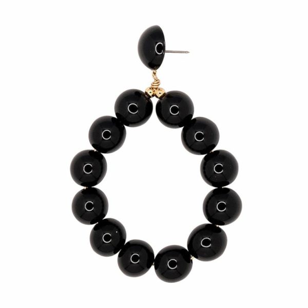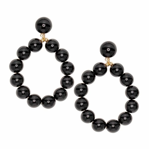 Product Description: Dramatic large black pearl balls are oh-so eye catching on these hoop shaped drop earrings.
