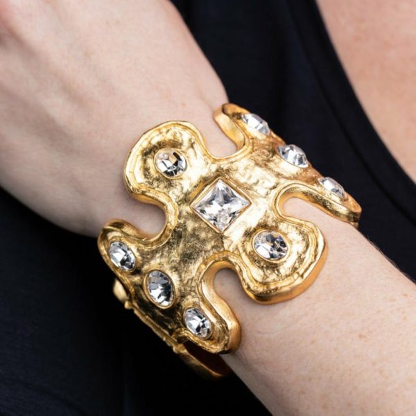 Product Description: Boldly sized, this tribal gold cuff bracelet is both sophisticated and statement making.