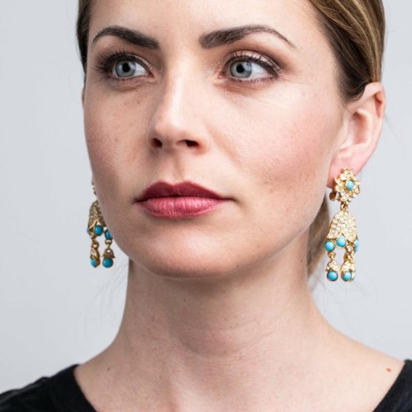 Product Description: The dazzling upside flower petal adds some fun and flair to these turquoise adorned drop clip earrings.