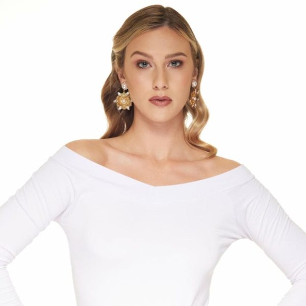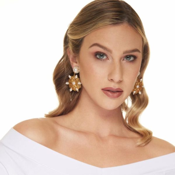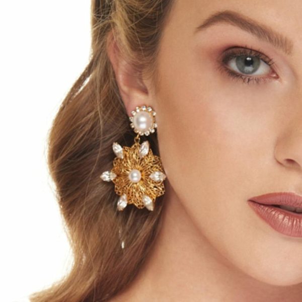 Product Description: These exquisite pierced earrings feature intricate filigree craftsmanship with brilliant crystals and lustrous pearls set in antique gold finish, creating a captivating luminous effect that catches the light beautifully.