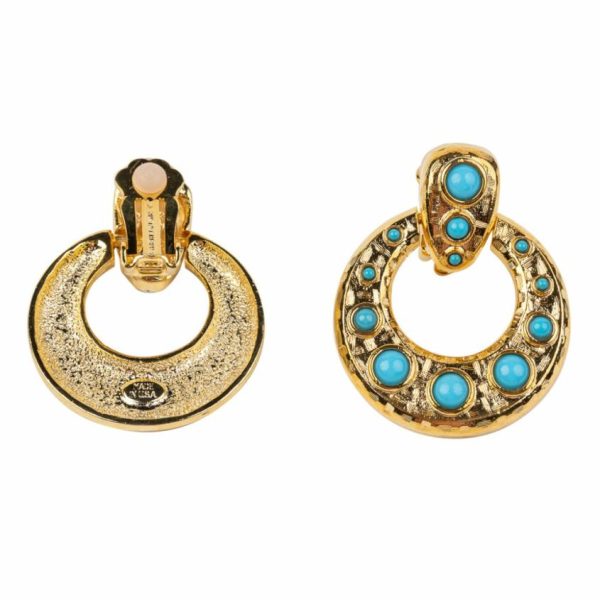 Product Description: These carefully crafted gold doorknocker clip earring with turquoise cabochons are the perfect piece to spice any look up.