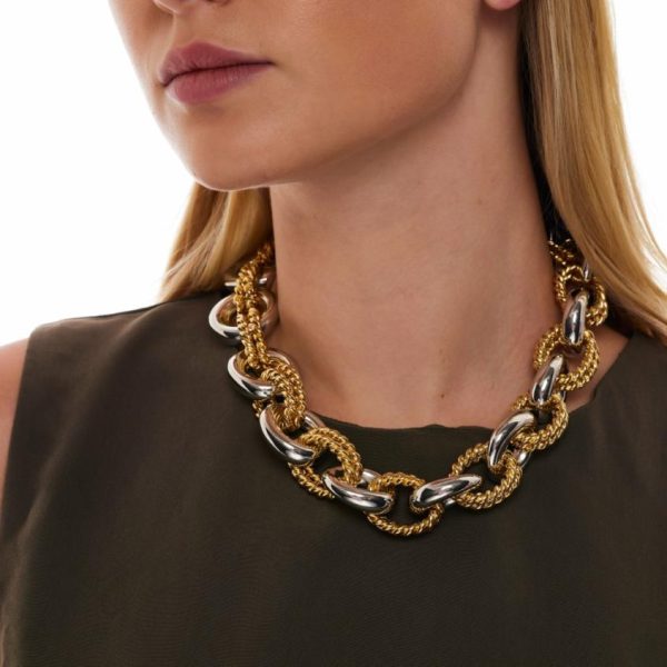 Product Description: Mixing metals is in! Make a statement with this double twist gold links and polished silver donut links toggle clasp necklace.