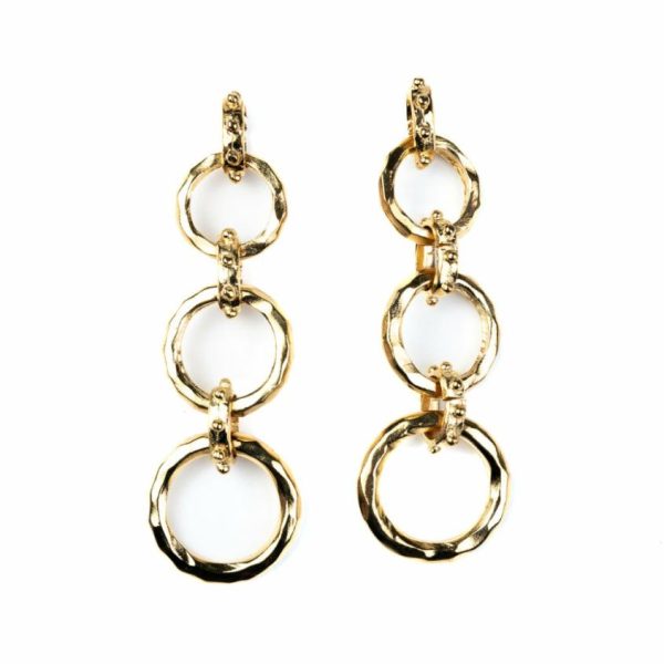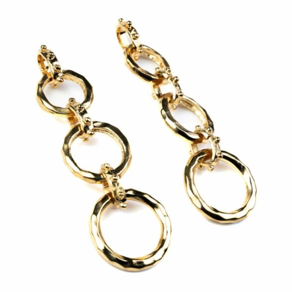 Product Description: Experience luxury with these classic gold hammered circle drop earrings. Crafted for a timeless aesthetic and perfect for any occasion, these earrings feature small to large circles finely hammered from gold for a shimmering, exclusive finish.