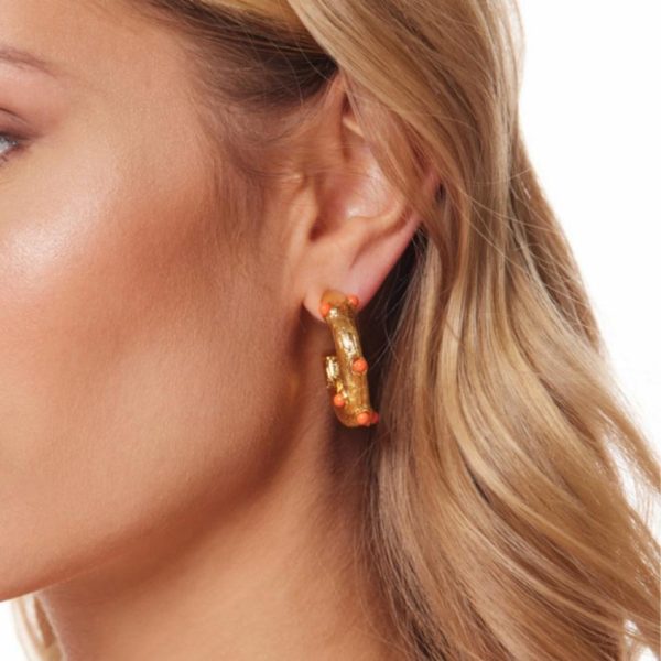 Product Description: These gold hoop post earrings featuring coral cabochons details are perfect to add a pop of color into any look.
