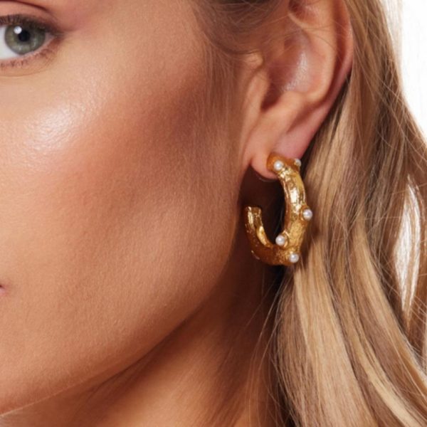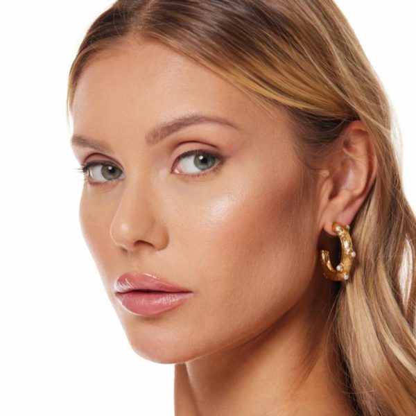 Product Description: These sophisticated gold hoop post earrings showcase exquisite pearl cabochon detailing that elevates any ensemble with timeless elegance.