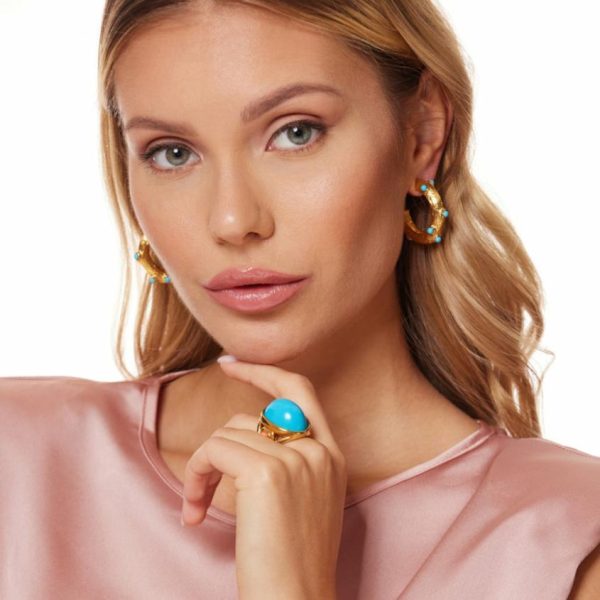 Product Description: Add this bold, bright turquoise cabochon center gold ring to your collection. This ring features coral cabochon dots that bring gorgeous color into any look.