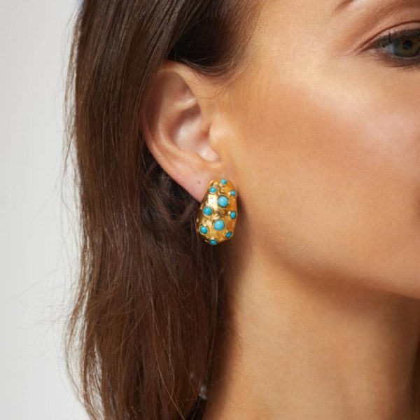 Product Description: These stunning gold chubby structure clip earrings featuring turquoise dot details finds the perfect balance between metallic and color.
