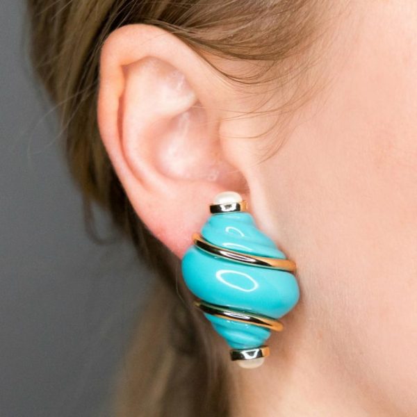 Product Description: Get your gold embellished, turquoise shell earrings with pearls before they are all gone!