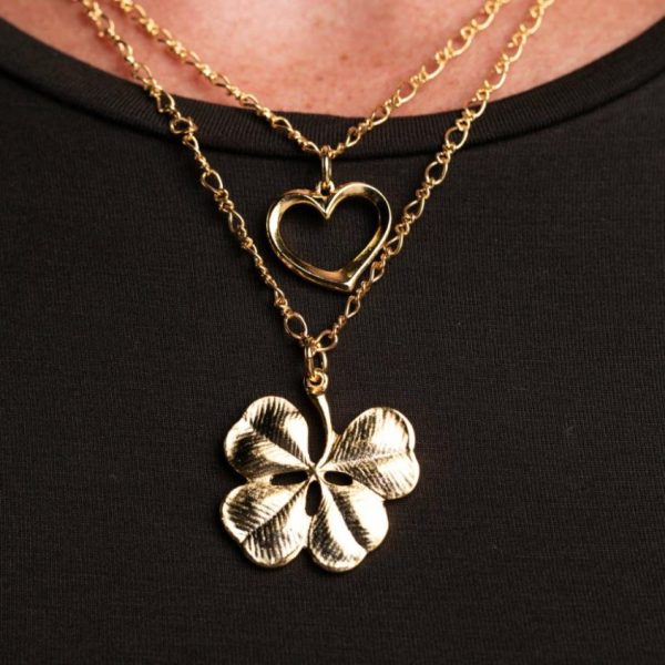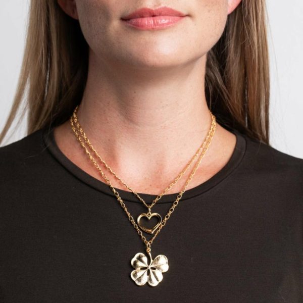 Product Description: Embrace luck and love with Kenneth Jay Lane’s Heart and Clover Double Chain Pendant Necklace. Clover and heart pendants sit on a delicate gold chain for a charming and dainty look.