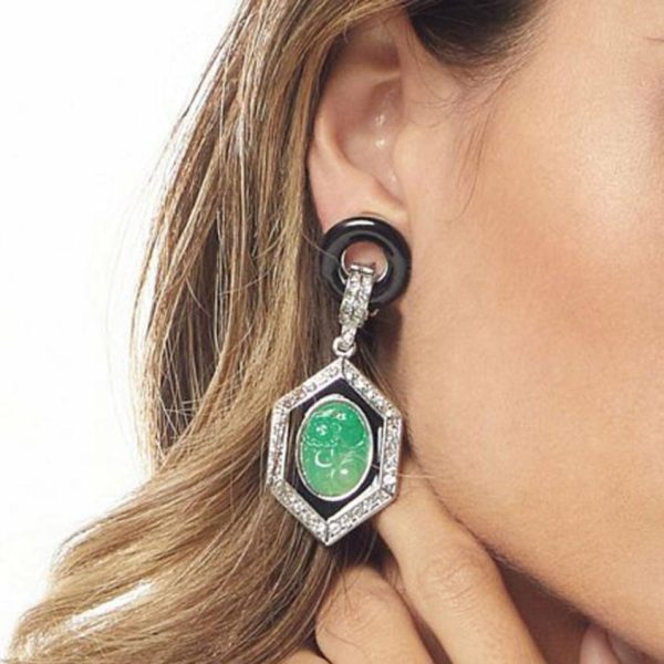 Product Description: A part of Kenneth Lane’s famous Art Deco Collection, this rhodium-plated, rhinestone-embellished hexagon shape drop earring is elevated with a carved jade oval center and clip-on closing. Jade is faux, comprised of resin.