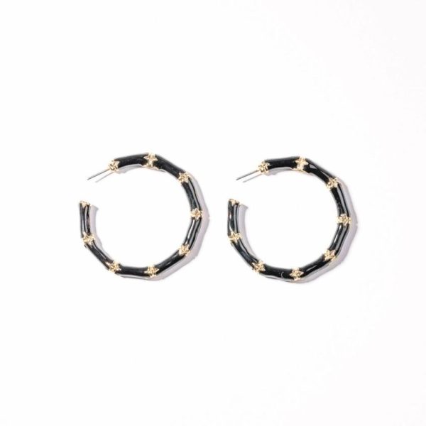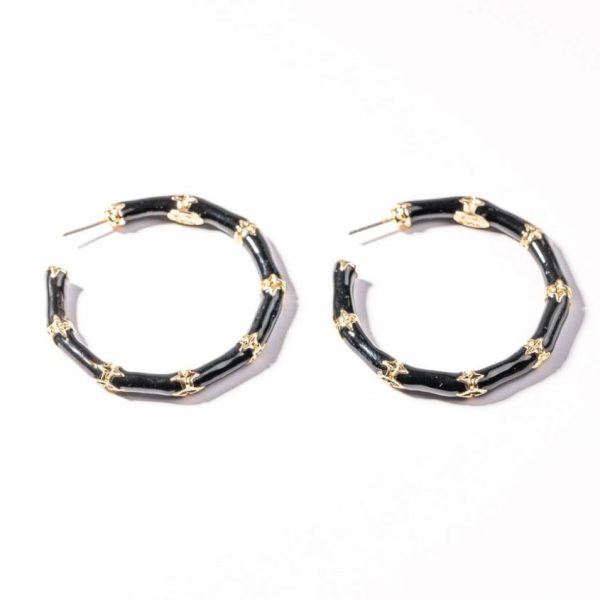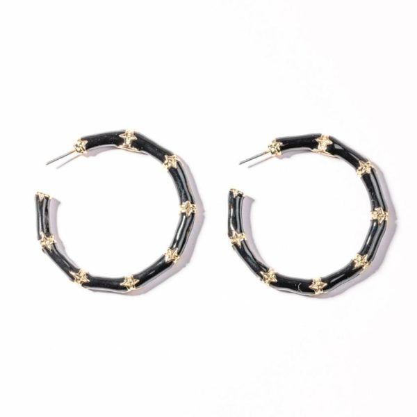 Product Description: Considered classic Kenneth Jay Lane yet chic in design, these black enamel “bamboo” pierced hoop earrings will teleport you to your favorite beach destination with just one wear!