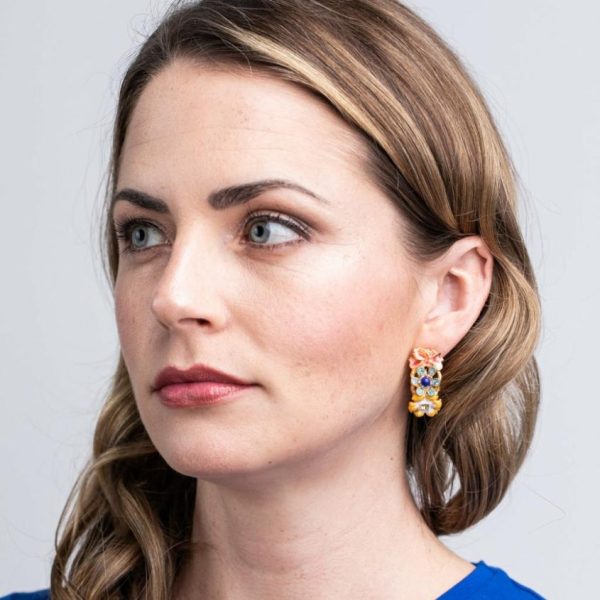 Product Description: Get ready for your next garden party with these beauties! Plated in 22-karat gold electroplating in the USA, these darling hoop earrings are bright with pastel enamel flowers and resin stone details. Sits comfortably with a clip-on closure.