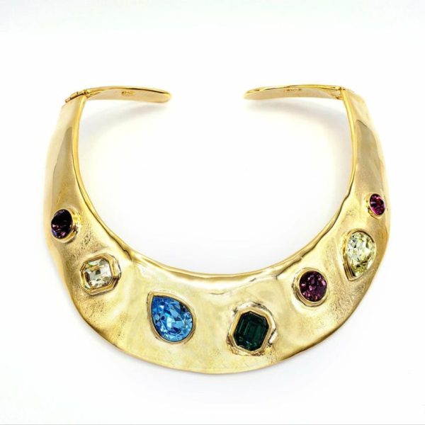 Product Description: Brightly colored gem stones shine on a gold hinged collar necklace that is sure to make a statement.