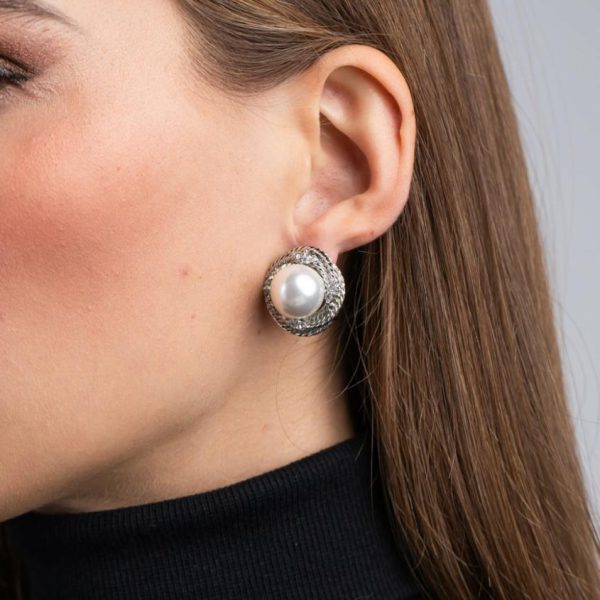Product Description: USA-made, these decadent clip-on earrings feature a round, faux white pearl encased in a rhodium-plated, rhinestone love knot twist.