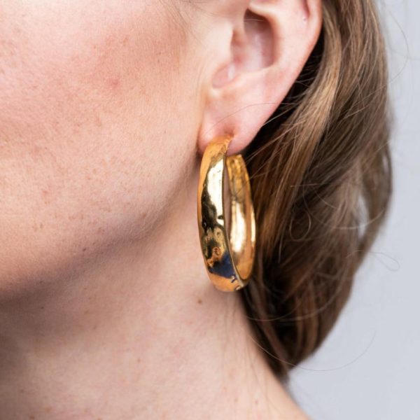 Product Description: You can never go wrong with a Kenneth Jay Lane gold hoop earring! Plated in gold with a “hammered” finish, this bold yet stylish pierced hoop earring will become a closet staple.