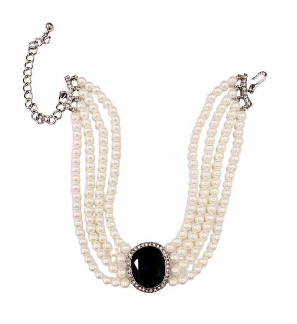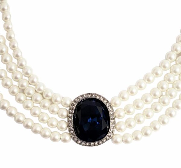 Product Description: Four rows of beautiful, 6 millimeter glass pearls meet in the middle with a faux sapphire stone adorned with small rhinestones. This choker, once worn by the iconic Princess Diana, is a symbol of royalty and elegance.