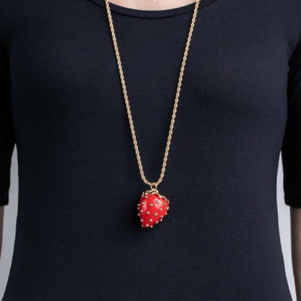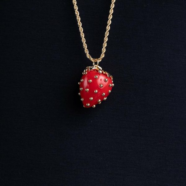Product Description: This bright and fun pendant necklace will have you craving strawberries for days. Red strawberry pendant with gold accents. Wears as tasteful as it looks with a delicious red coloring to brighten any outfit.