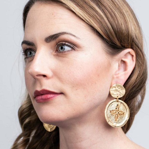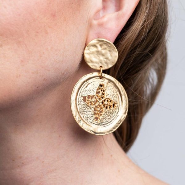 Product Description: Channel the season’s exotic inspiration with these satin gold coin drop pierced earrings engraved with flowers.