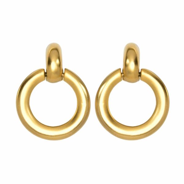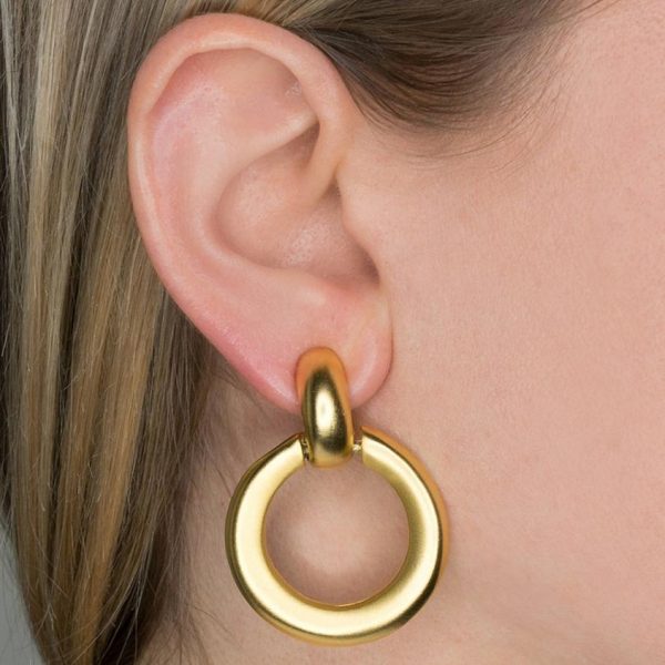 Product Description: Satin/brushed gold-plated round door knocker earrings are lightweight with a clip-on back. As seen on supermodel Imaan Hamman on the Winter 2017 cover of Porter Magazine.