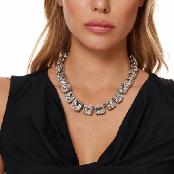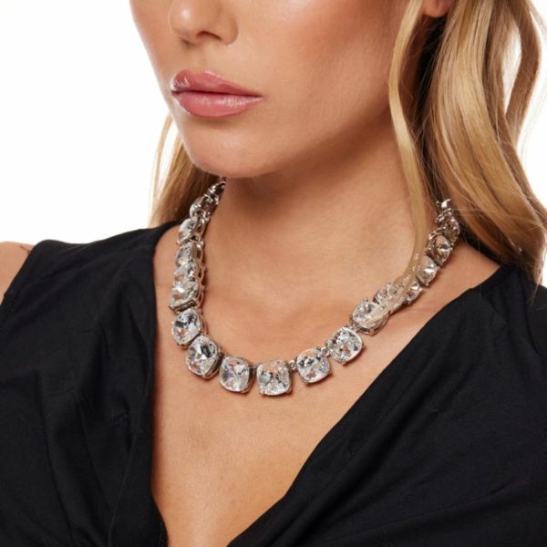 Product Description: Instantly bring your look to another level with this silver and crystal graduated stone hook clasp necklace. As seen on Lady Gaga and her dog!