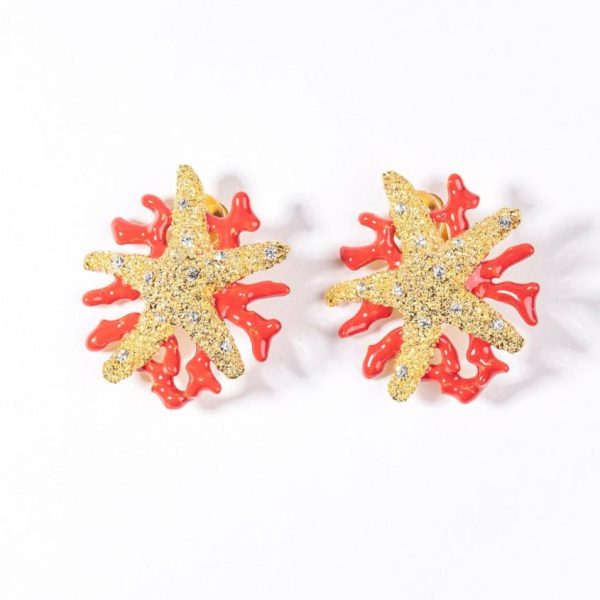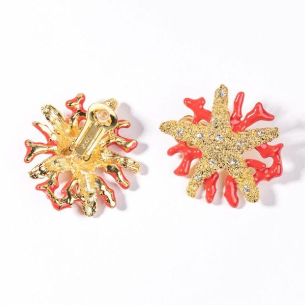 Product Description: These dazzling gold and crystal starfish clip earring featuring dark coral enamel branches is a wonderful statment piece for your collection.